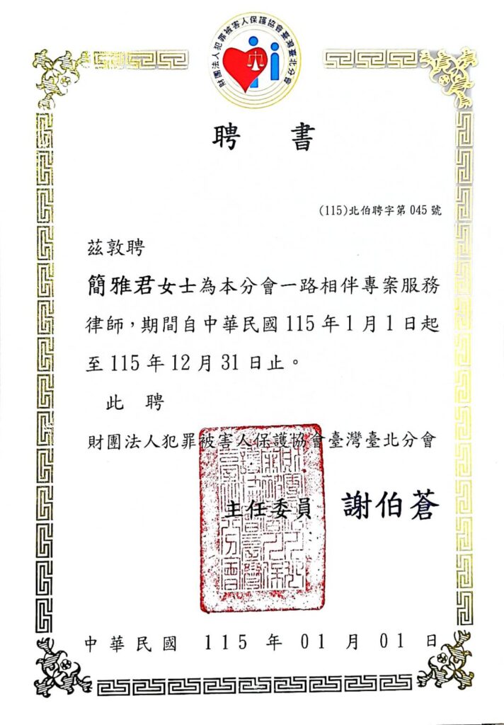 本所簡雅君律師獲聘115年度犯罪被害人保護協會義務律師CHINCHU1 4 月, 2026最新消息 本所簡雅君律師獲聘115年度財團法人犯罪被害人保護協會臺灣臺北分會義務律師。簡雅君律師將全力協助犯罪受害者,提供法律諮詢和支援,希望透過專業知識,幫助更多人走出陰影,重拾生活信心! 標籤# 犯罪被害人# 義務律師